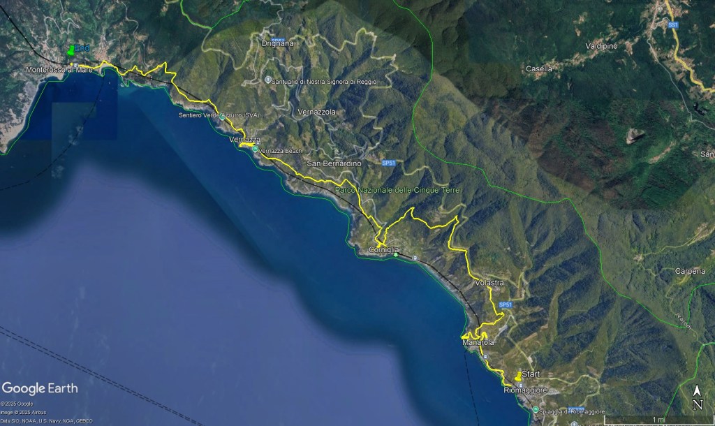 Located just outside Cique Terre Italy lies an excellent network of hiking trails connecting the villages of Roimaggiore, Maarola, Corniglia, Vernazza, and Monterosso Al Mare. We hiked it one way and then took the train back to our starting point. Due to frequent temporary trail closures it is important to visit the park website before you go. We went in late September of 2024 and one trail closure required taking a longer route resulting in a 13 mile hike shown below. If all trails are open, it is possible to travel the distance from Riomaggiore to Monterosso al Mare in 7 miles. While the towns along the trail are the highlights, the coastal views from the trail are spectacular. The trail sees a significant amount of traffic, especially near the towns along the way. Proper footwear (no open toe shoes) is not only needed but enforced by law. While it was demanding and sometime hot, it is a hike highly recommended for the unique experience and photographic opportunities.