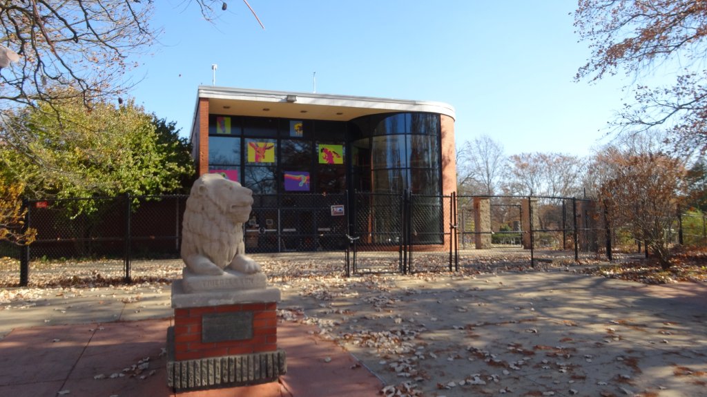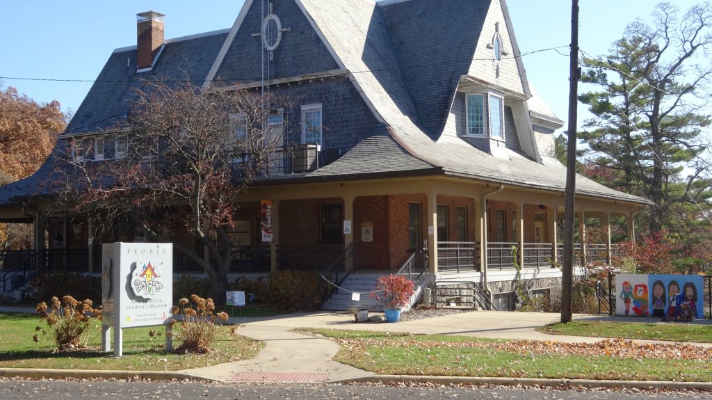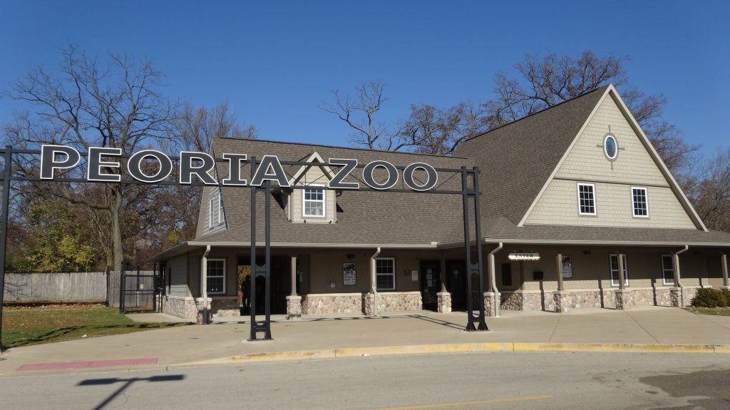 mile 2.1 Turn left and cross the service road after you pass the historic white hexagon shaped concession stand. The Peoria Playhouse will be on your right. Taking the sidewalk that cuts across another playground and head towards the zoo.
