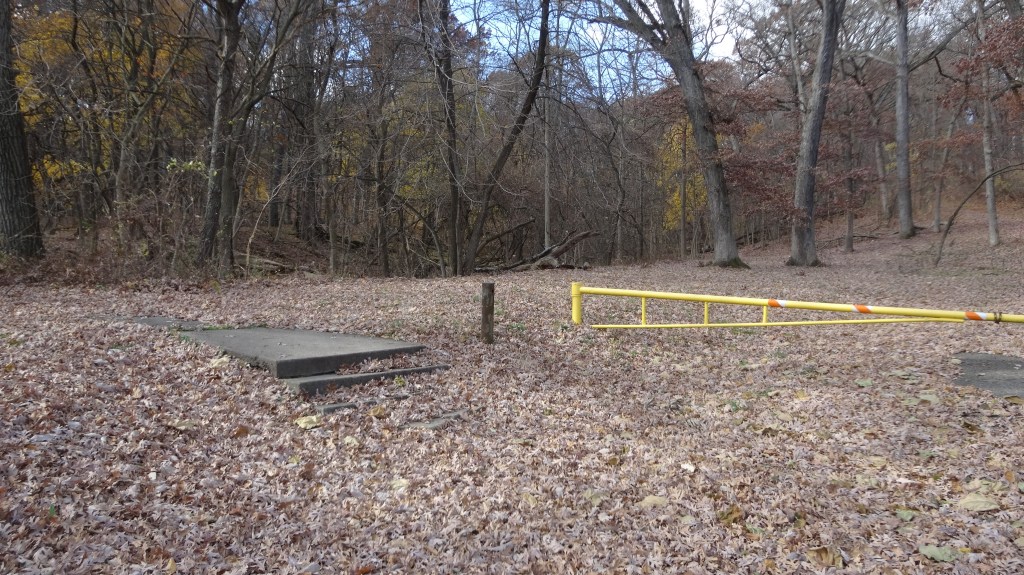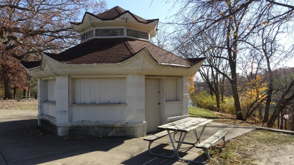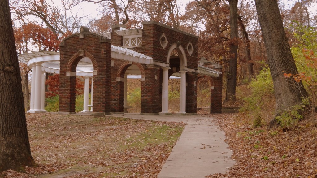 mile 1.6 Continue straight (west) as you pass by the round historic decorative picnic shelter made of red brick and white wood. Look for the path (concrete) leading up the hill. Take the one that goes to the left, paralleling the service road. It should start just a few feet west of the picnic shelter.