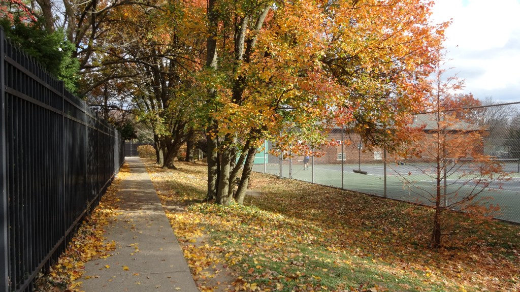 mile 2.4 Take the sidewalk between the tennis courts (north). Take a right turn when you come to the fence around the botanical gardens.
