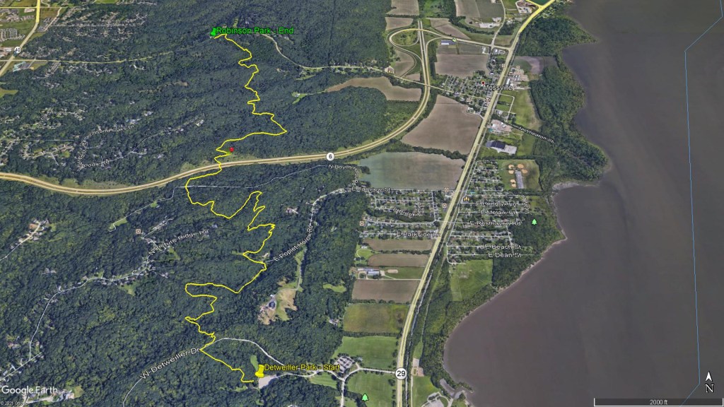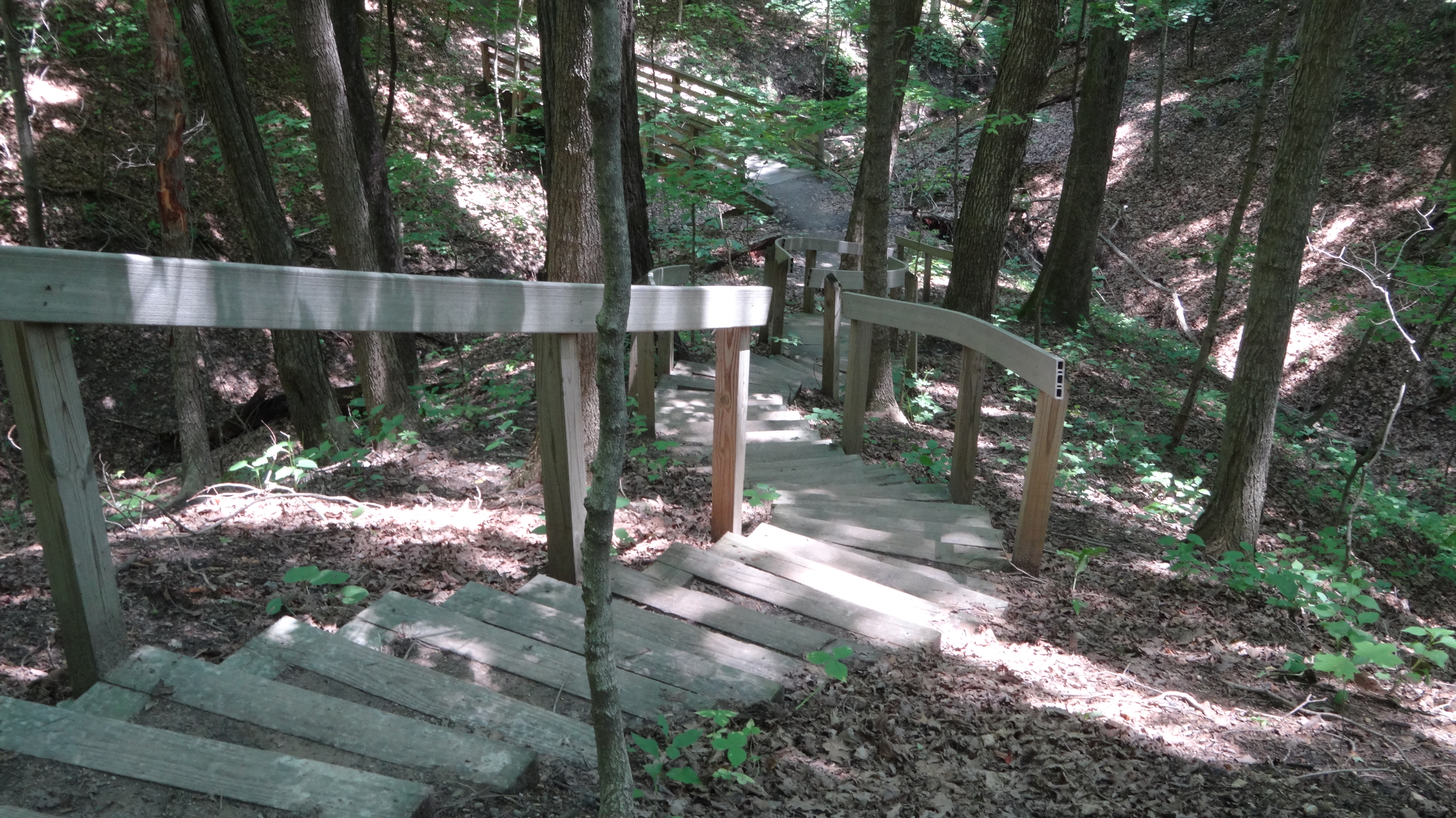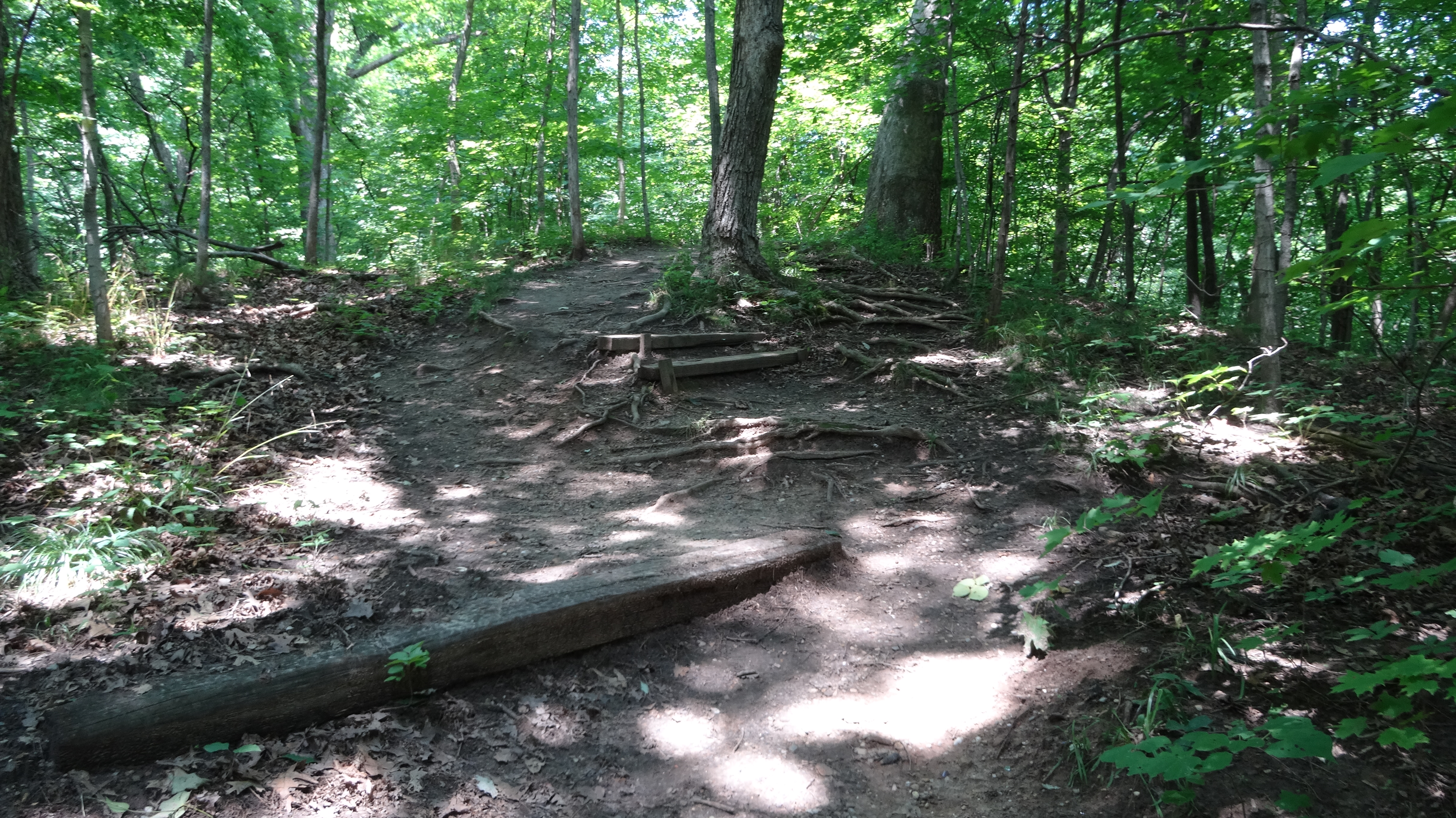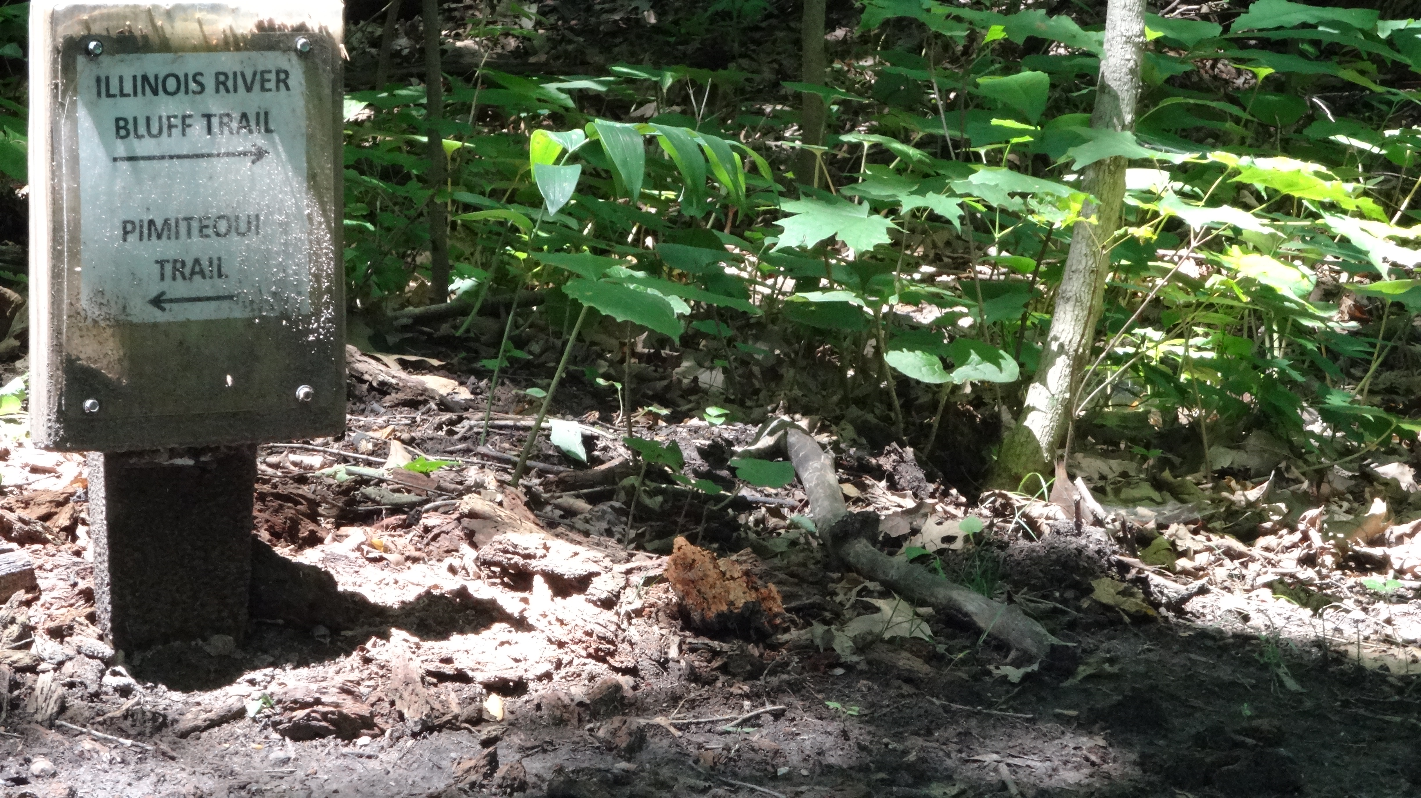 The Illinois River Bluff Trail is one of the premier trails in the Peoria area. It will take you through miles of deep forest dominated with towering oaks, an abandon homestead, and passes through park district property that was formerly the Salvation Army Green Valley Camp. The trail delivers more elevation gain and loss than any other long hike in the Peoria area. Because of the constant accents and descents, most hikers will find this 4.7 section to be more than enough challenge. This 4.7 section also receives somewhat lighter use than the 2.2 mile section between Camp Wakonda and Robinson Park. The number of bridges over creek crossings is very notable. The park district and local Boy Scout Troops have also done an excellent job with stairsteps and waterbars for erosion control. This one way hike requires two vehicles, parking one at the ending which is in the south parking lot of Robinson Park off of Mossville Road. For reference, the entire Illinois River Bluff Trail is 6.9 miles from Camp Wakonda (mile 0.0) to Detweiller Park. This explains why you start at mile marker 6.9 at the Pimiteoui trailhead in Detweiller. Watch for the sideways teardrop shaped trail markers for route-finding. There are places where staying on the main trail requires attention to these small markers which are usually placed on a post. See by the mile route guide below.
