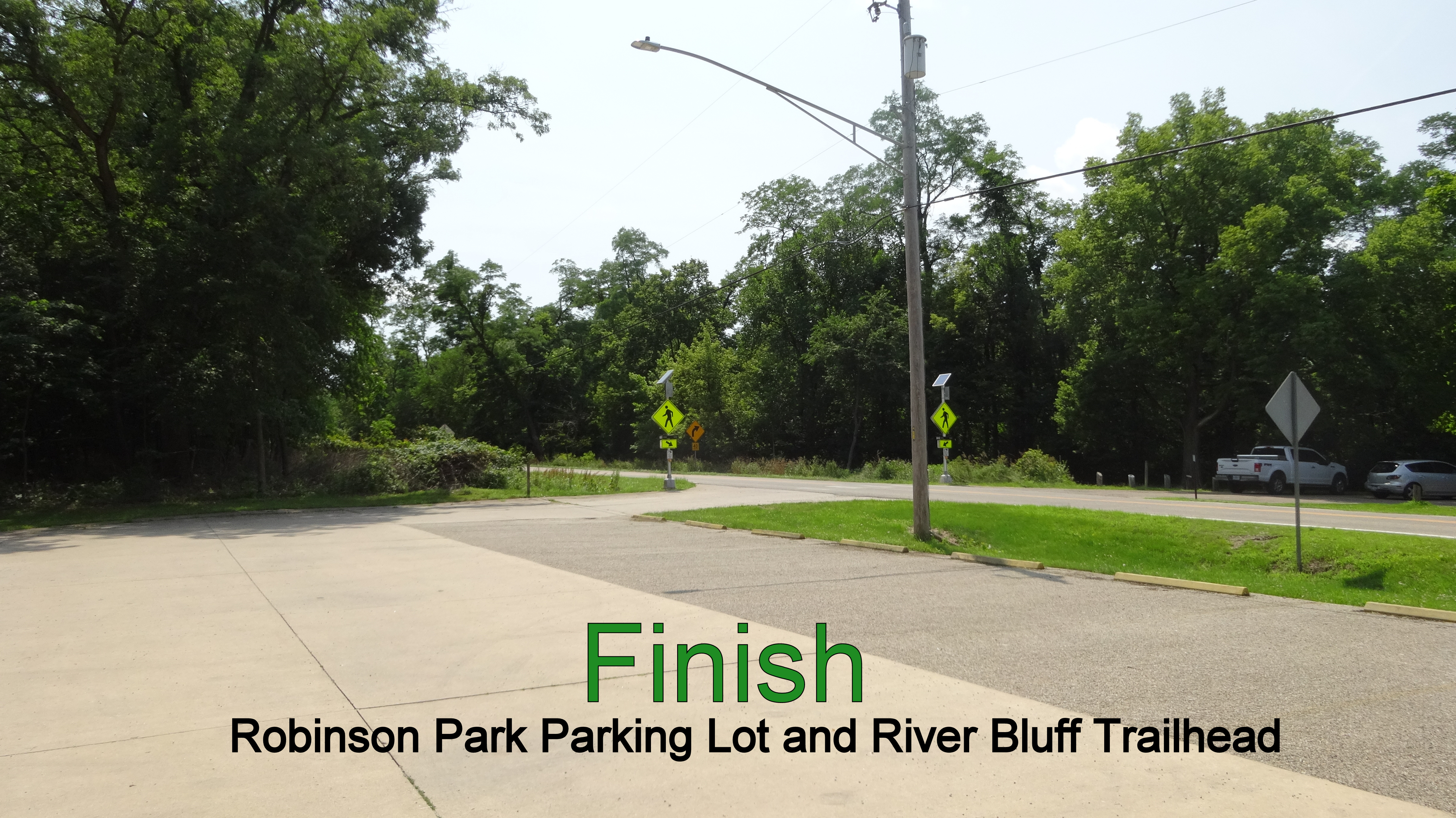 mile 4.7(2.2) END. Enter the parking lot where you left a car or have a ride waiting. This is Robinson Park South Lot, on 200 W. Mossville Road. There are restrooms across the road in the main developed part of the park.