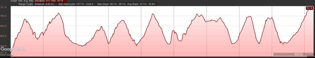 - Elevation gain / loss: +1577 ft / – 1344ft