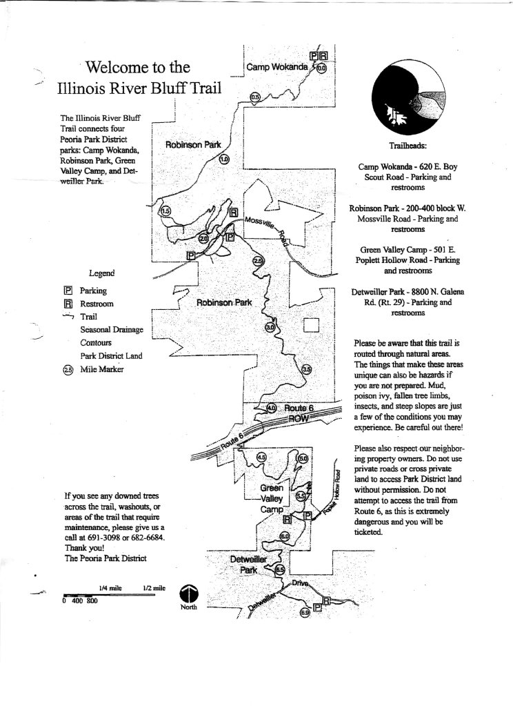 mile 0.0(6.9) START Park near the Pine Shelter parking lot at Detweiller Park, 8800 N. Galena Rd (Rt 29) Peoria, IL. Look for the Pimiteoui trail head nearby. You will see the mile 6.9 marker at the start.