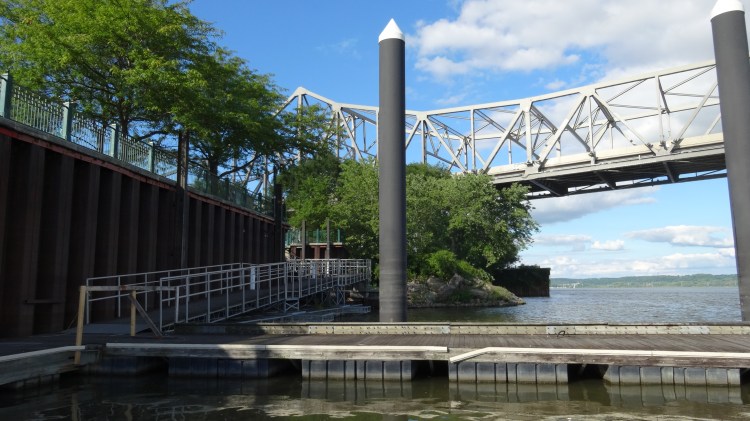 mile 0.3 – A walkway down to the river is on your right. This is access to boat docks and a good place to see the bridge and river up close.