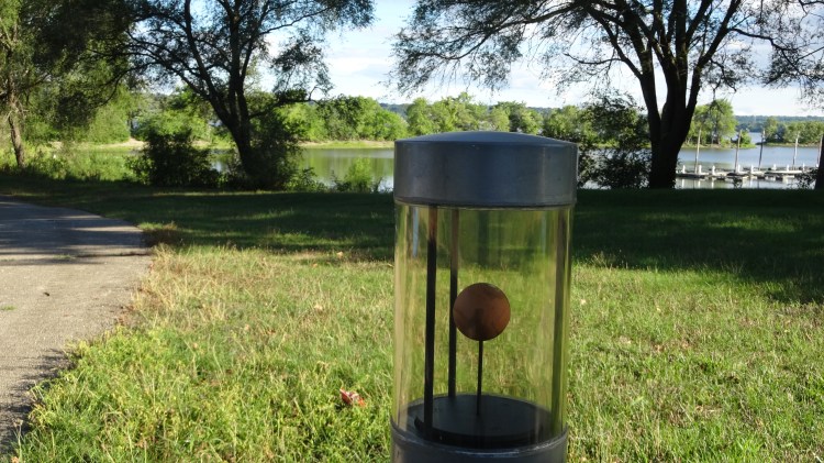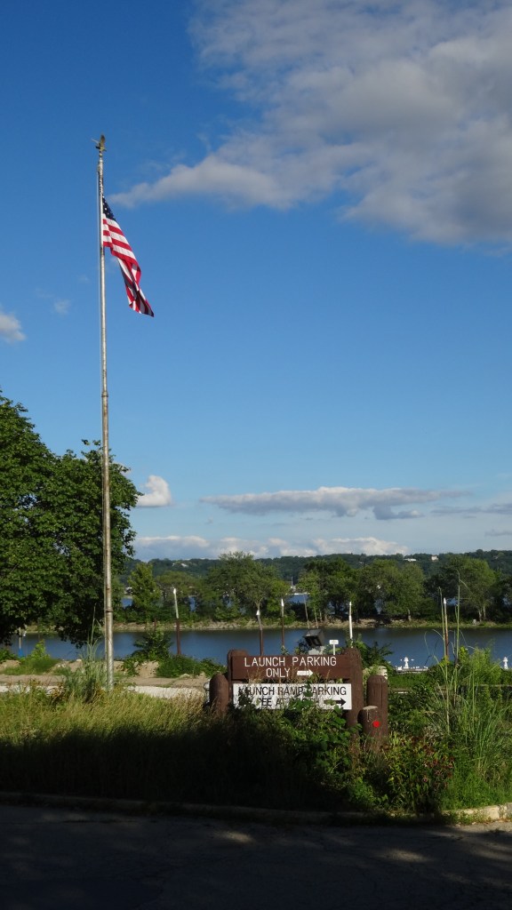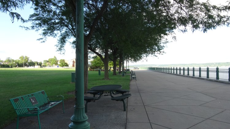 mile 3.0 – ** on your return trip be sure to turn right at the fork in the trail to the spur trail to Constitutional Gardens. While small, this is must see stop especially in the summer. You can spot it by the circle of flags flying. The physical address is 101 Morton St. Peoria IL which is the entrance to the parking lot. Built in 1987, it is a memorial to the formation of the US Constitution. There is a parking lot here also. In fact this lot would be a good spot to begin and end this same hike.