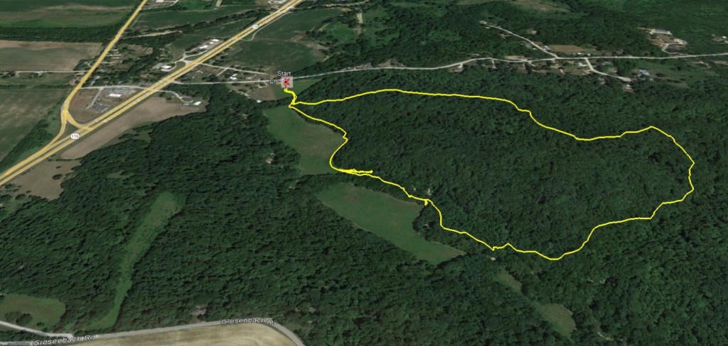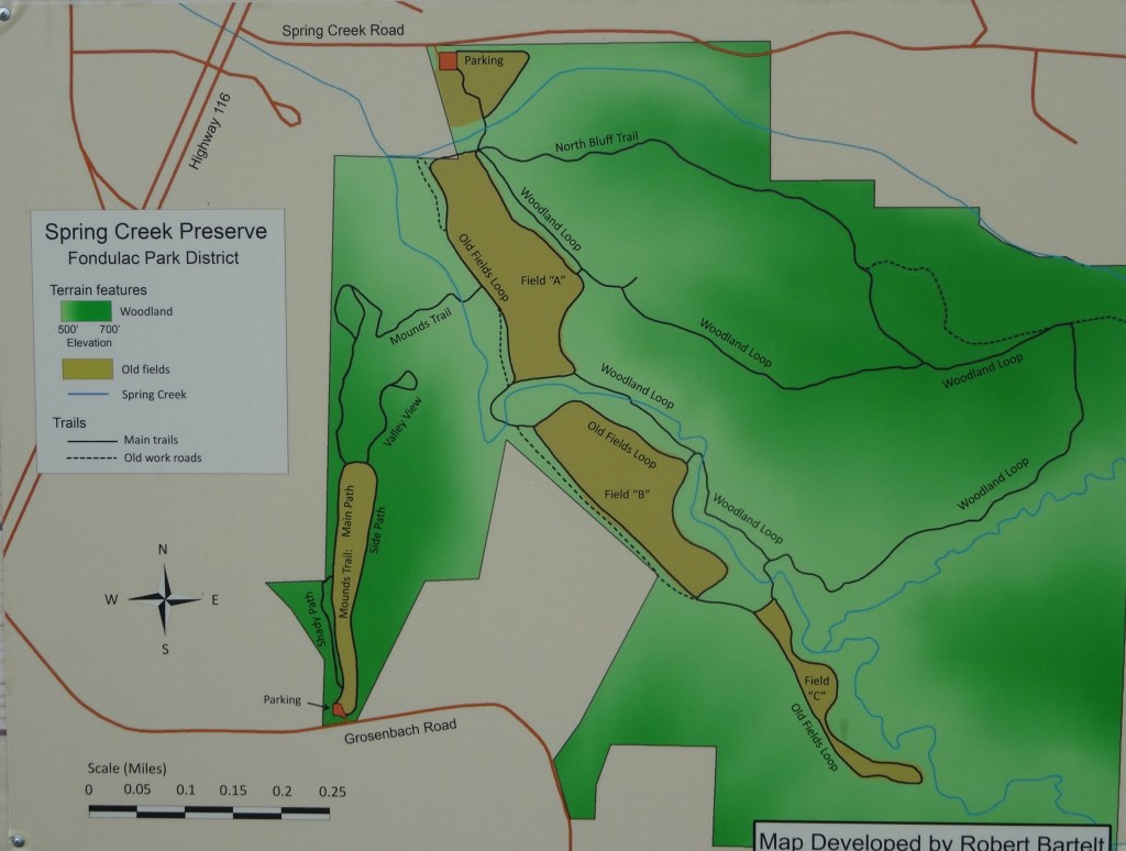 This trail is located in a 262 nature preserve managed by the Fondulac Park District. It is a very short drive from both Peoria, IL and Washington, IL. This route has a few creek crossings that could be challenging right after a rain, but otherwise they will likely be dry. There is a large parking lot at the Spring Creek Road trailhead which is just 0.2 miles off US Route 116. There are other trails in this nature preserve but the one described cover the deepest forest and has the most elevation change.