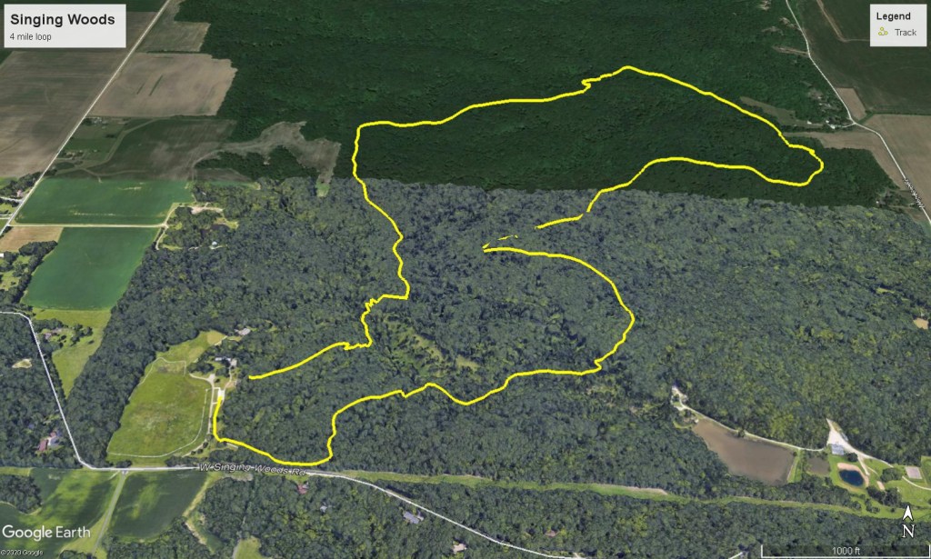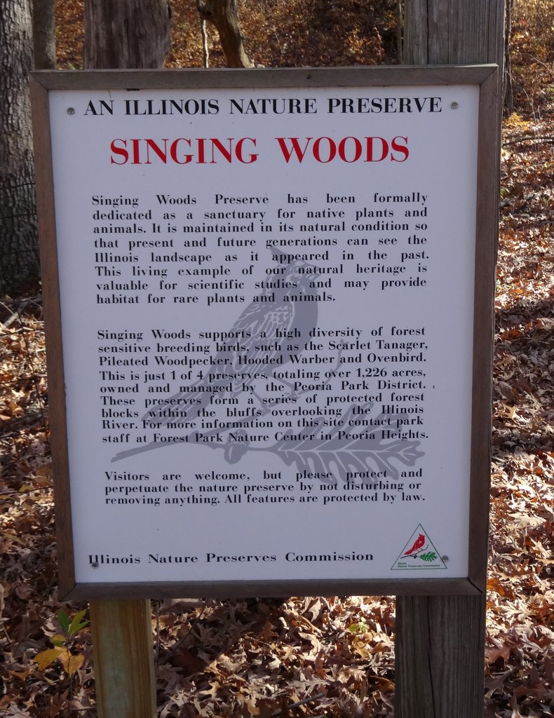 This loop hike is the longest route through the lightly used Singing Woods Nature Preserve located just north of Peoria Illinois. 700 acres of deep forest make this a must do trip if you enjoy up and down hiking with old growth tree cover. The trail is very well maintained with good footbridges over the creek crossings. See by the mile route guide below.