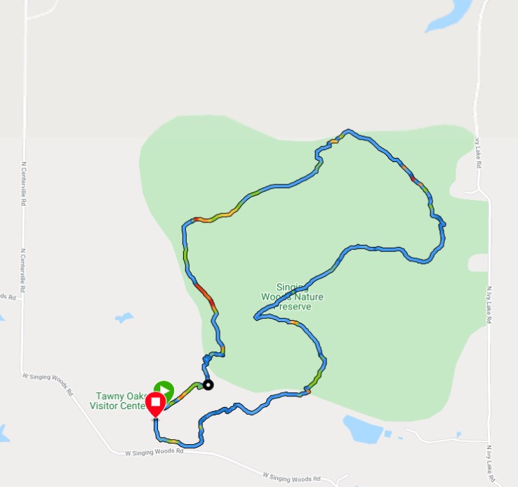 mile 0.0 START Park at the Tawny Oaks Station parking lot located just off W Singing Woods Road. To locate Tawny Oaks off W Singing Woods Road, you will want to watch for a mail box #715 by a fence with twin stone stone pillar/posts. After parking in the first lot, proceed to the Singing Woods trailhead which is well marked and just past the picnic shelter. Head down the trail. You are on Forest Trail. The milage for the turns listed below are approximate. The trail is well marked with both mile markers ever 0.5 miles and trail map signposts along the route. This route is in the CLOCKWISE direction.