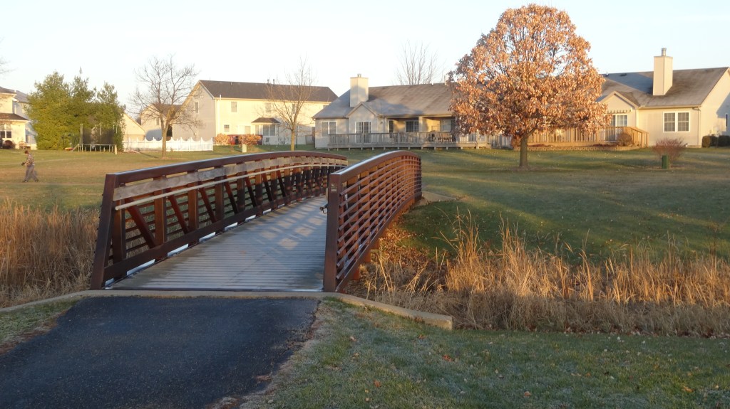 mile 3.8 – Head across the steel bridge in the park and follow the sidewalk between houses on your left and apartments on the right.