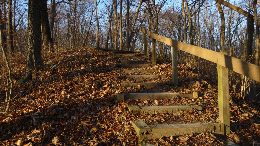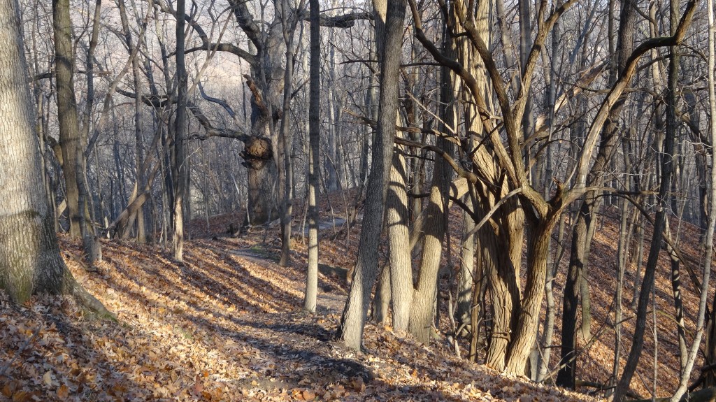 This route provides just over a “half marathon” 13.4 vs 13.1 miles worth of paved and woodland trail hiking. It is all on surfaces which are very good for trail running or hiking. The elevation gain and loss is almost exclusively in the Robinson Park, Illinois River Bluff Trail, and Detweiller Park trail sections which comprise one half (6.8 miles) of the route. The Rock Island Greenway (RIG)Trail along with bike paths and sidewalks through North Peoria connect you to Robinson Park off an access point in the 700 block of W Wrookforest Dr. From there you connect with Detweiller Park trails and then hike sections on lightly trafficked city streets to get back to the Peoria Greenway Trailhead. An advantage to this long loop is that there many good locations to start/end as it passes multiple public parking lots locations.