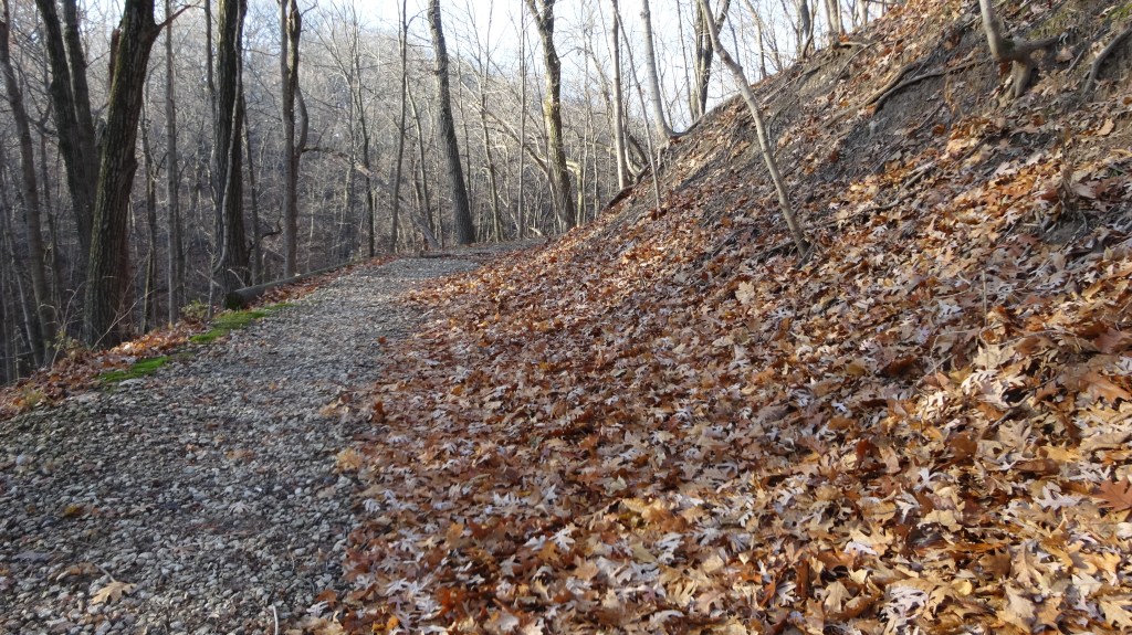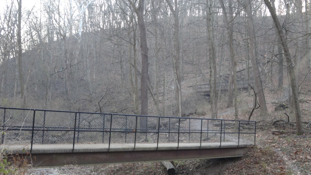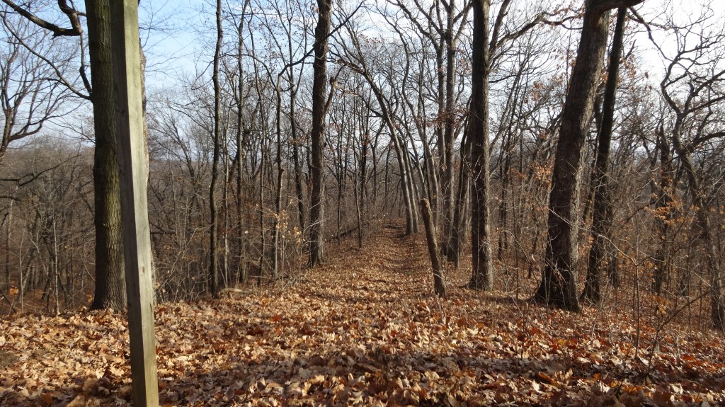mile 6.0 – Cross Mossville Road in the crosswalk connecting the two Robinson Park parking lots. Once across the road and in the south lot, there are two ways to follow the Illinois River Bluff trail. One trail is to the left (east) and is the more established, wide trail. A second route is on the right and heads west initially. It is less traveled and requires a little more careful navigation. Both trails intersect at a concrete bridge with chain-link railing.